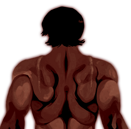 prominent scars adorn shoulders, downcast clavicles. πtigmata of the wings, fleshy colored.