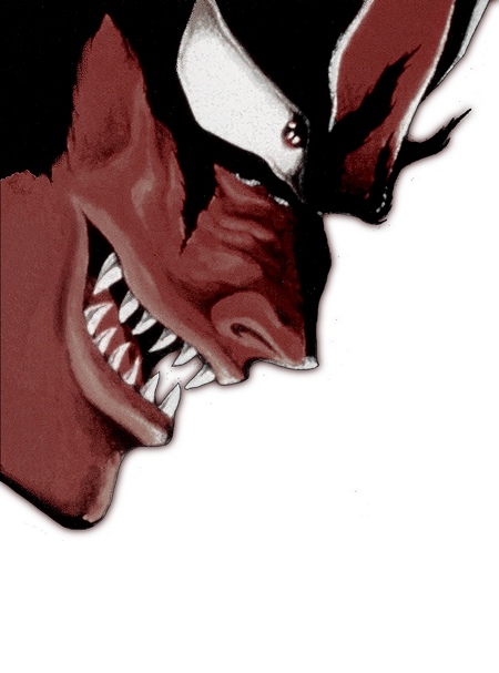 reforming his body to mirror Amon's biology, teeth have been whetted οΉ honed as WEAPONS fit for rending flesh from bone, coupled with nails' protein evolving into claws ββββββ efficient in dismantling bodies piece by piece. amplified soma has also gifted him the propensity to sustain οΉ survive FATAL attacks / wounds. Amon's immortality has been distributed through possession, stalling Akira's physical aging οΉ maintaining a freshly appearance of 20's manhood.while in his 'true' form, Devilman dons twin horn β like wings on either side of a furred crown, entirety of legs coated in fur down to clawed feet, οΉ a trigonal tipped tail. forehead is cast in a shade of crimson skin, piercing audits that are accentuated by stigmata. flesh on forearms are fissured, shaped into spikes for combat purposes. large bat β like wings sprout from his back, leaving behind binary scars that embellish his skin. in this form, he stands at a 14' zenith, but can heighten to a colossal 30'.